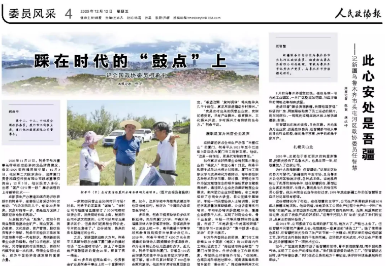 【人民政協(xié)報(bào)】2025年12月12日,人民政協(xié)報(bào)專訪柯希平文章《踩在時(shí)代的“鼓點(diǎn)”上》,刊登于第4版“委員風(fēng)采”欄目,照寧記者手記《致敬民營(yíng)企業(yè)家,致敬奮斗者》同步刊登??孪F剑旱谑⑹?、十四屆全國(guó)政協(xié)委員,廈門市工商聯(lián)主席,廈門恒興集團(tuán)有限公司董事長(zhǎng)。2025年11月27日,柯希平作為董事長(zhǎng)帶領(lǐng)低空經(jīng)濟(jì)知名品牌奧捷龍,參加2025亞洲通用航空展;12月3日,他以第二大股東身份,出席廈門奧普拓自控科技有限公司股東董事交流會(huì);12月5日,他以投資人身份,出席“國(guó)產(chǎn)GPU第一股”摩爾線程的上市敲鐘儀式……在新質(zhì)生產(chǎn)力賽道加速布局并收獲頗豐的柯希平,在接受記者采訪時(shí)樸實(shí)地說:“作為農(nóng)民的兒子,創(chuàng)業(yè)30多年來,我走對(duì)的每一步,都是因?yàn)榫o跟了國(guó)家經(jīng)濟(jì)命脈的跳動(dòng)?!睆募缣艮r(nóng)產(chǎn)品“趕集”,到如今的商業(yè)版圖涵蓋冶金礦產(chǎn)、商業(yè)貿(mào)易、民辦教育、文化旅游、資產(chǎn)管理、股權(quán)投資等多個(gè)領(lǐng)域,柯希平的經(jīng)歷正是改革開